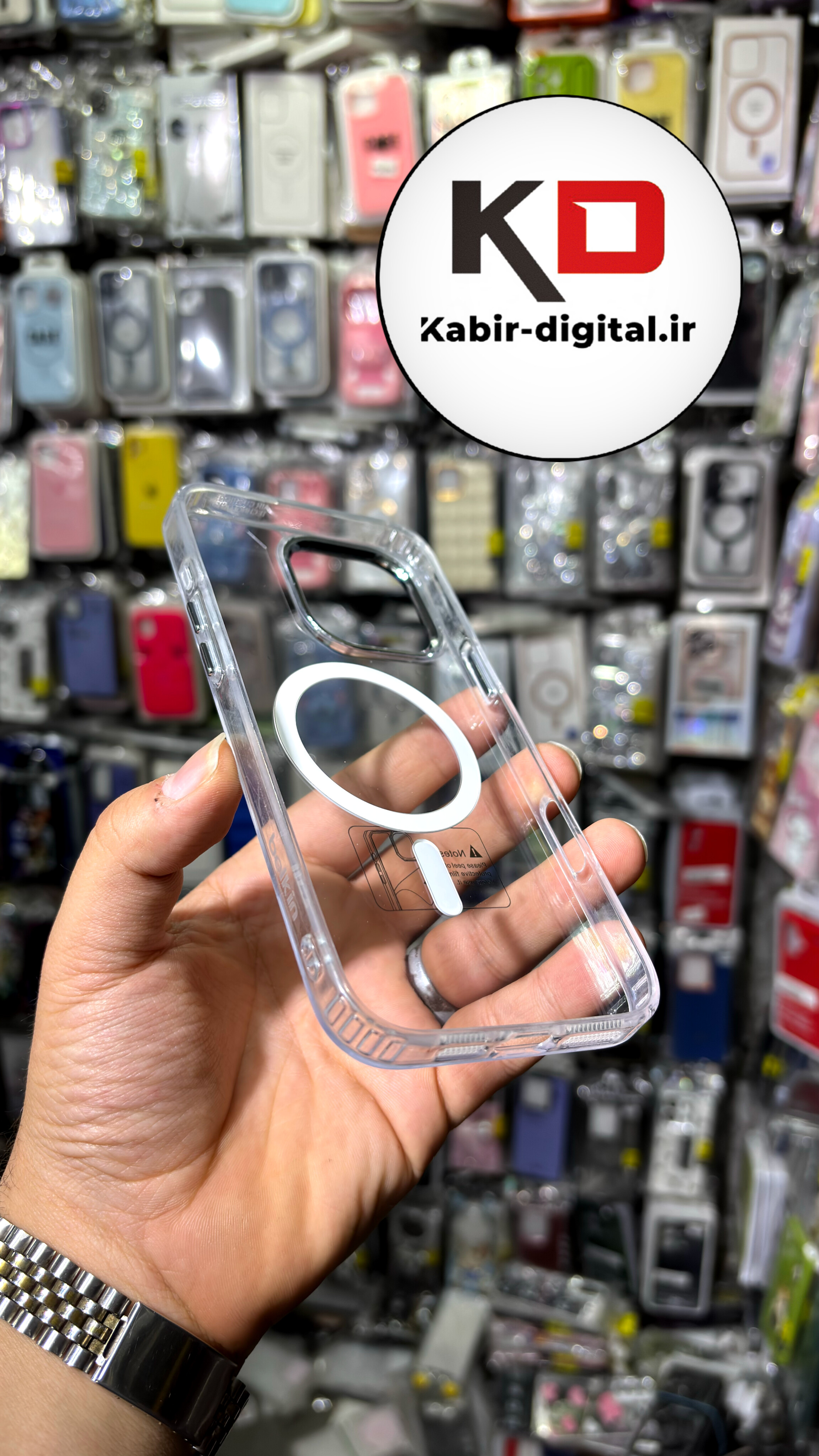 قاب گوشی iPhone ۱۶ pro max آیفون اورجینال بلکین belkin طرح طلقی شیشه ای شفاف لنز کرومی مگ سیف دار