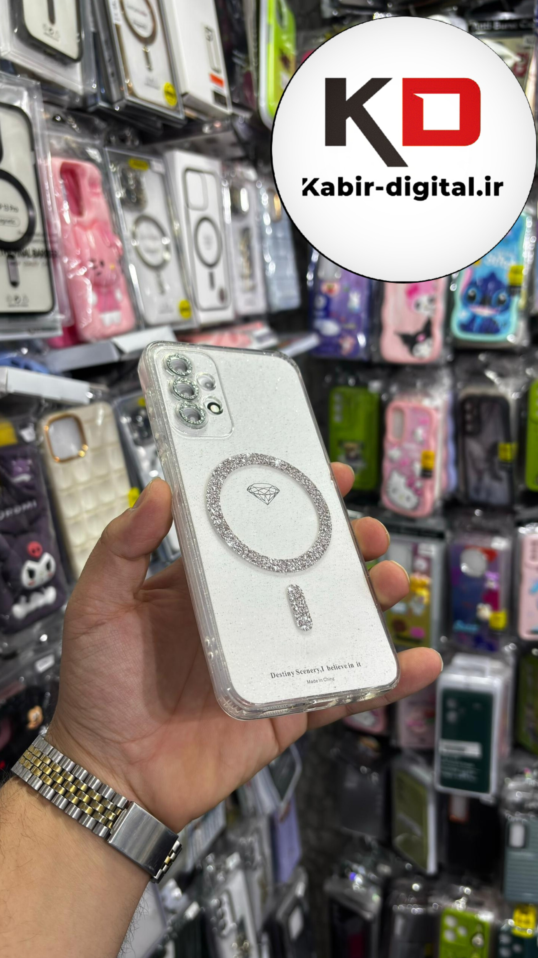 قاب گوشی Galaxy A13 4G /A23 4G سامسونگ الکتروپلیتینگ ژله ای شفاف اورجینال طرح مگ سیف نگین دار شاین محافظ لنز دار سفید
