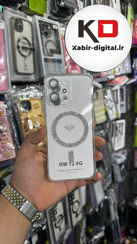 قاب گوشی Redmi 12شیائومی الکتروپلیتینگ ژله ای شفاف اورجینال طرح مگ سیف نگین دار شاین محافظ لنز دار سفید
