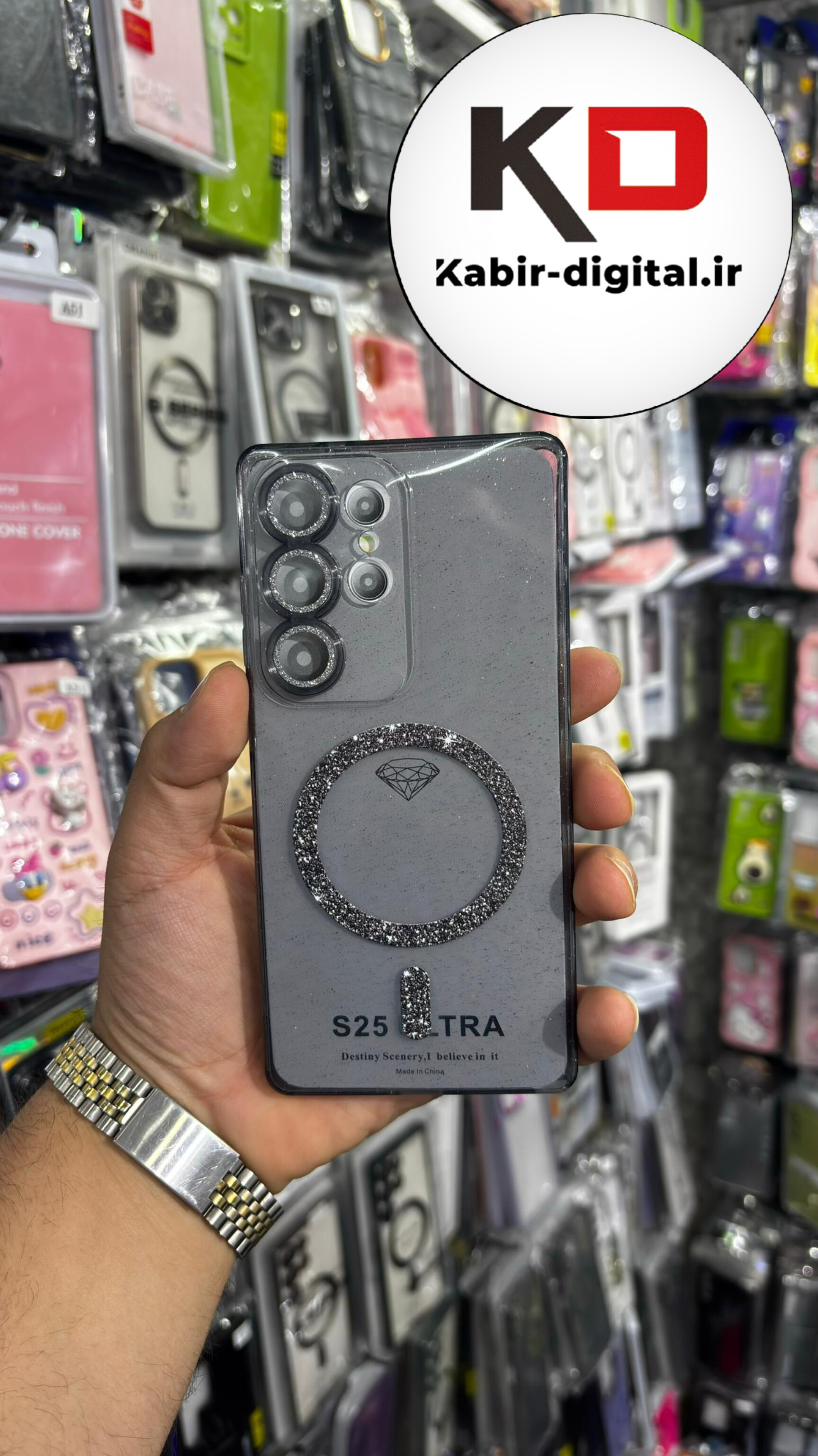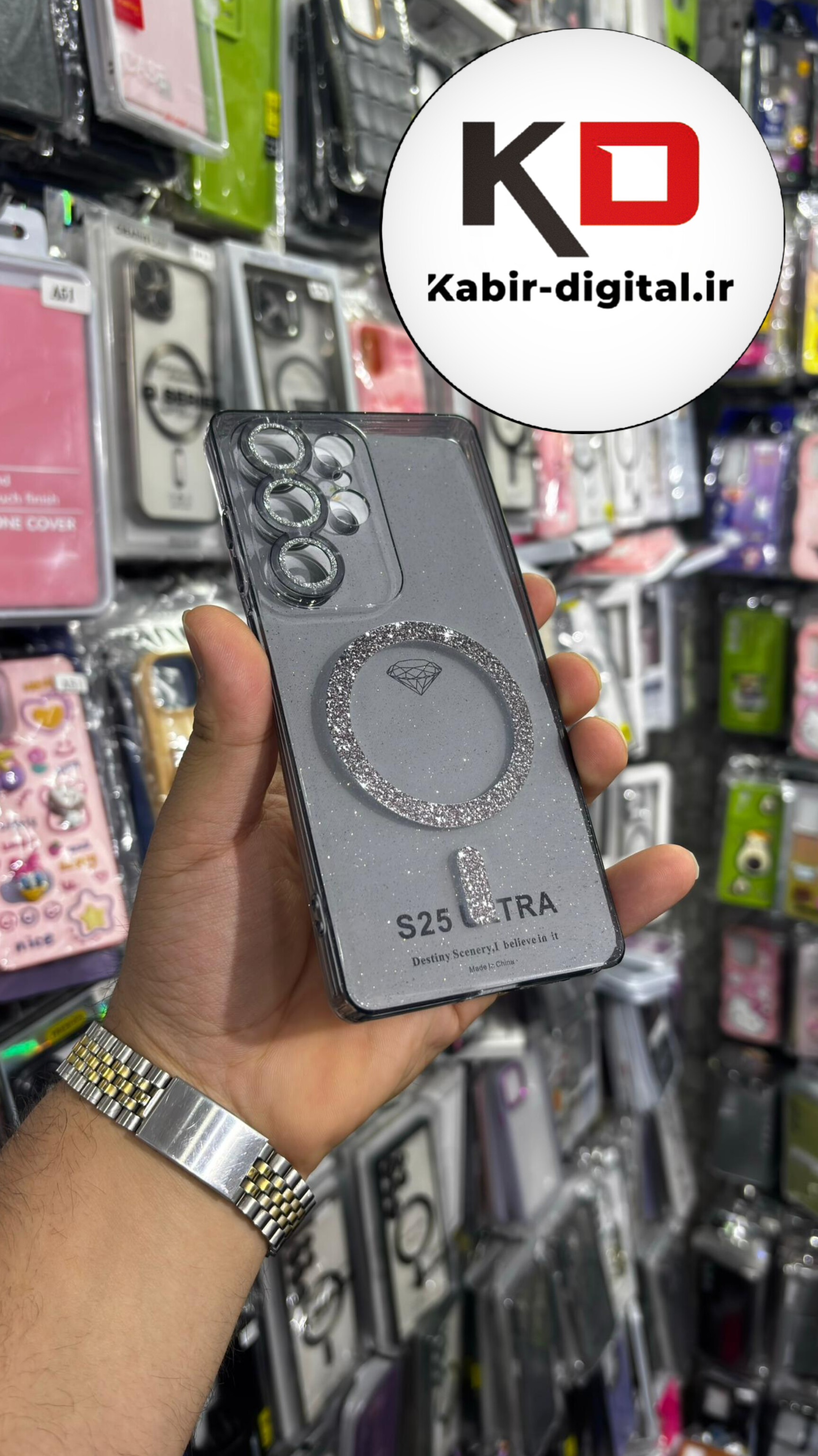 قاب گوشی Galaxy S25 Ultra سامسونگ الکتروپلیتینگ ژله ای شفاف اورجینال طرح مگ سیف نگین دار شاین محافظ لنز دار مشکی