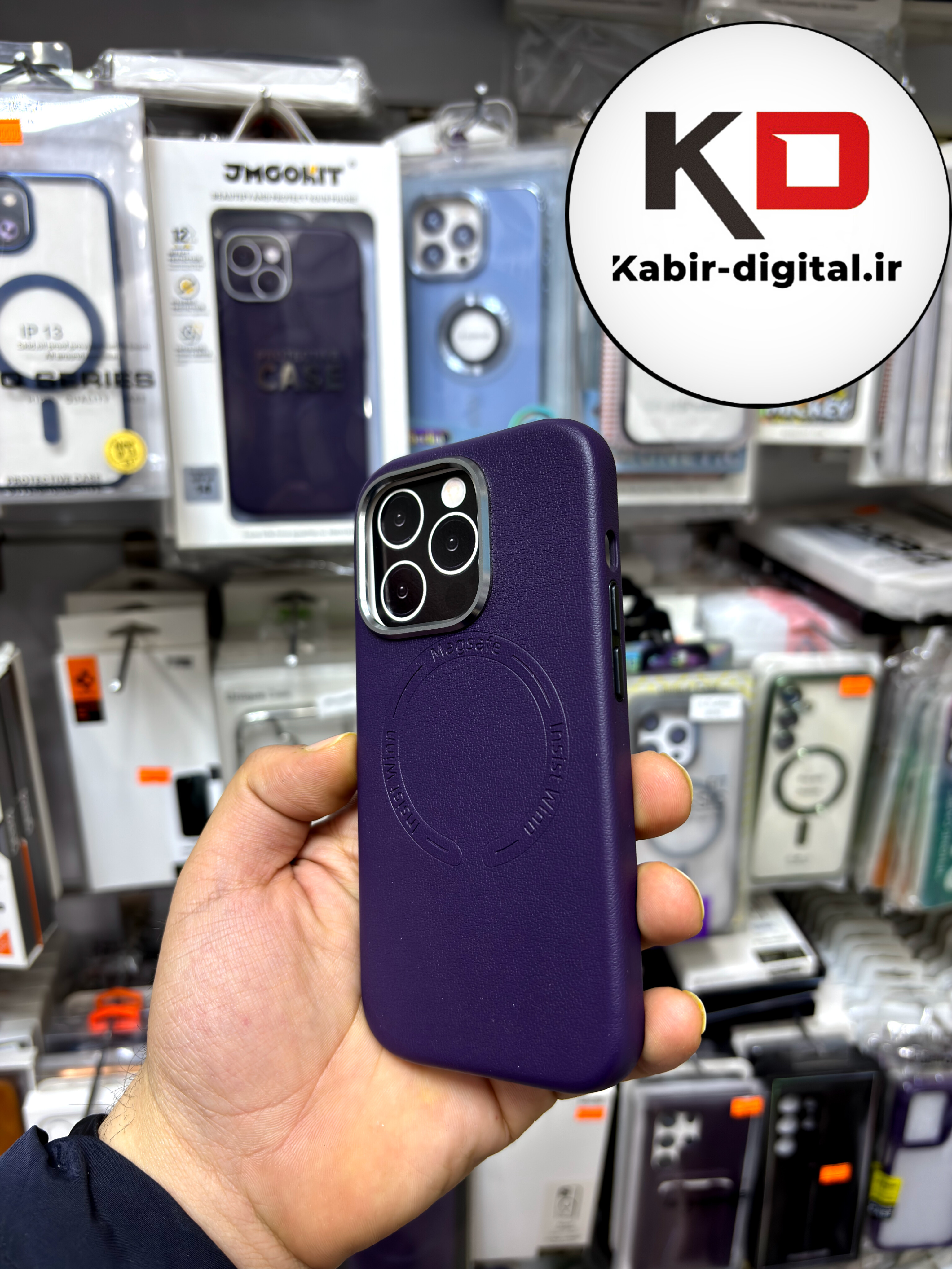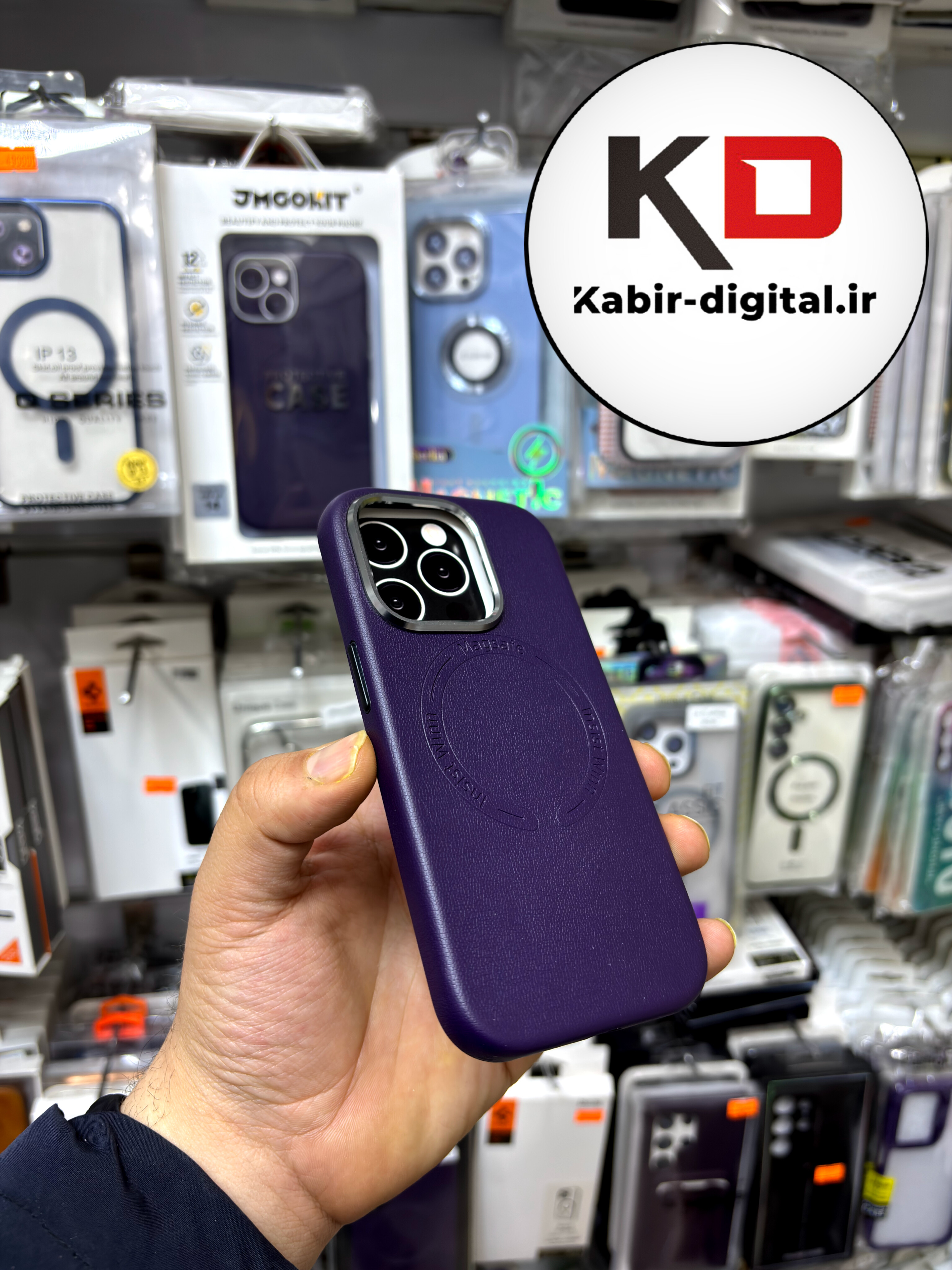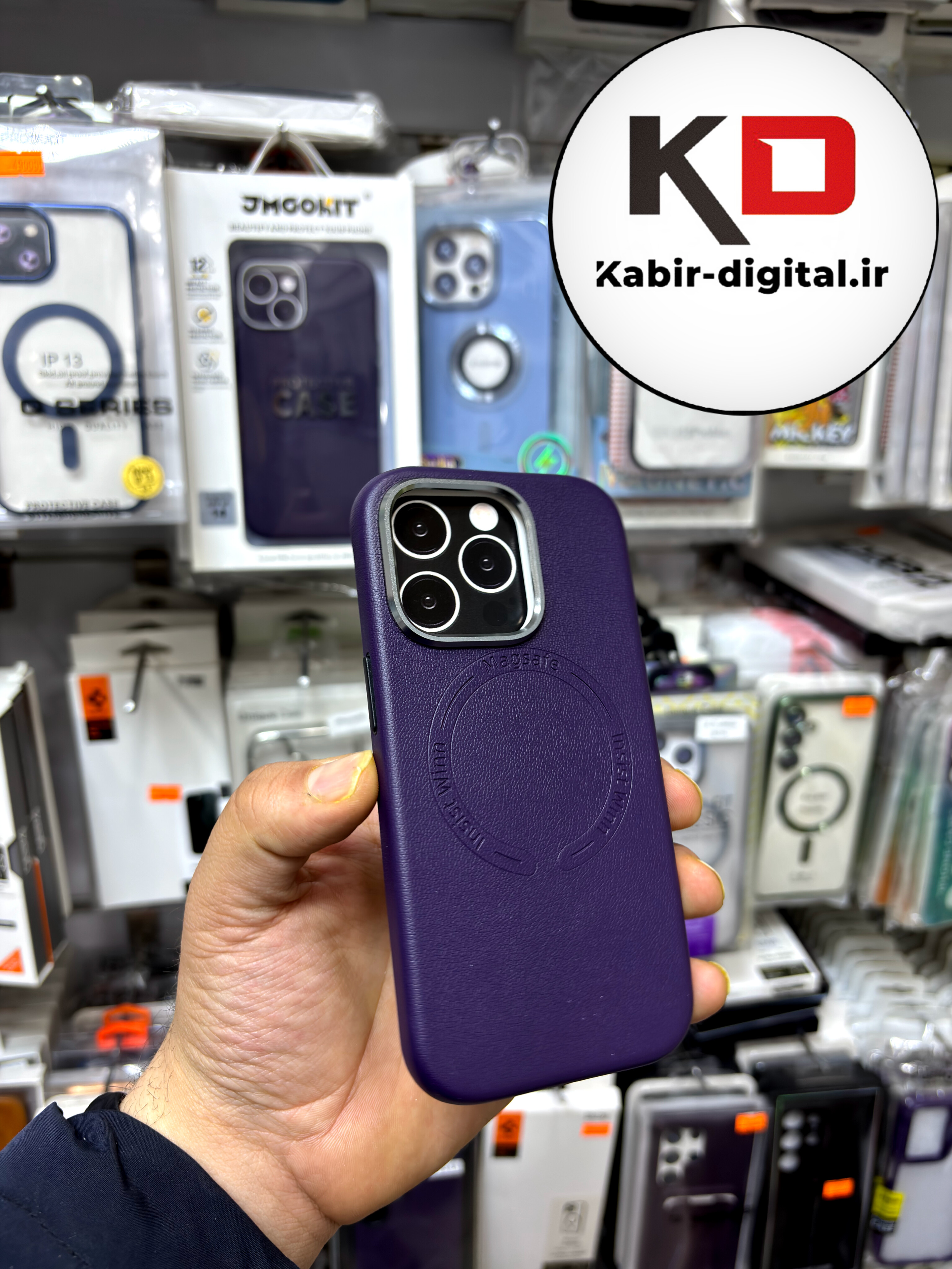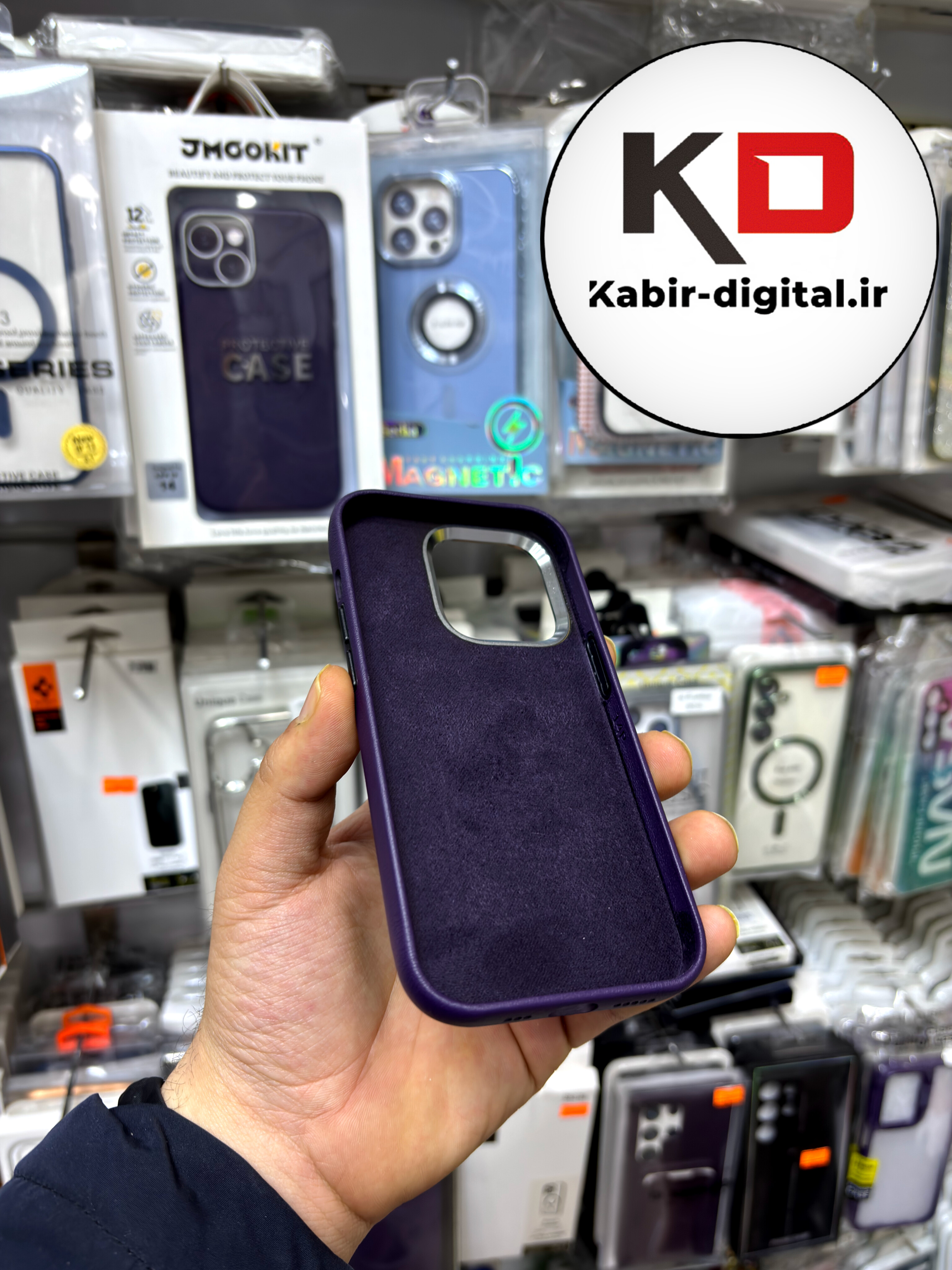 کاور گوشی آیفون iphone 14 Pro طرح چرم اورجینال مگ سیف لنز کرومی بنفش