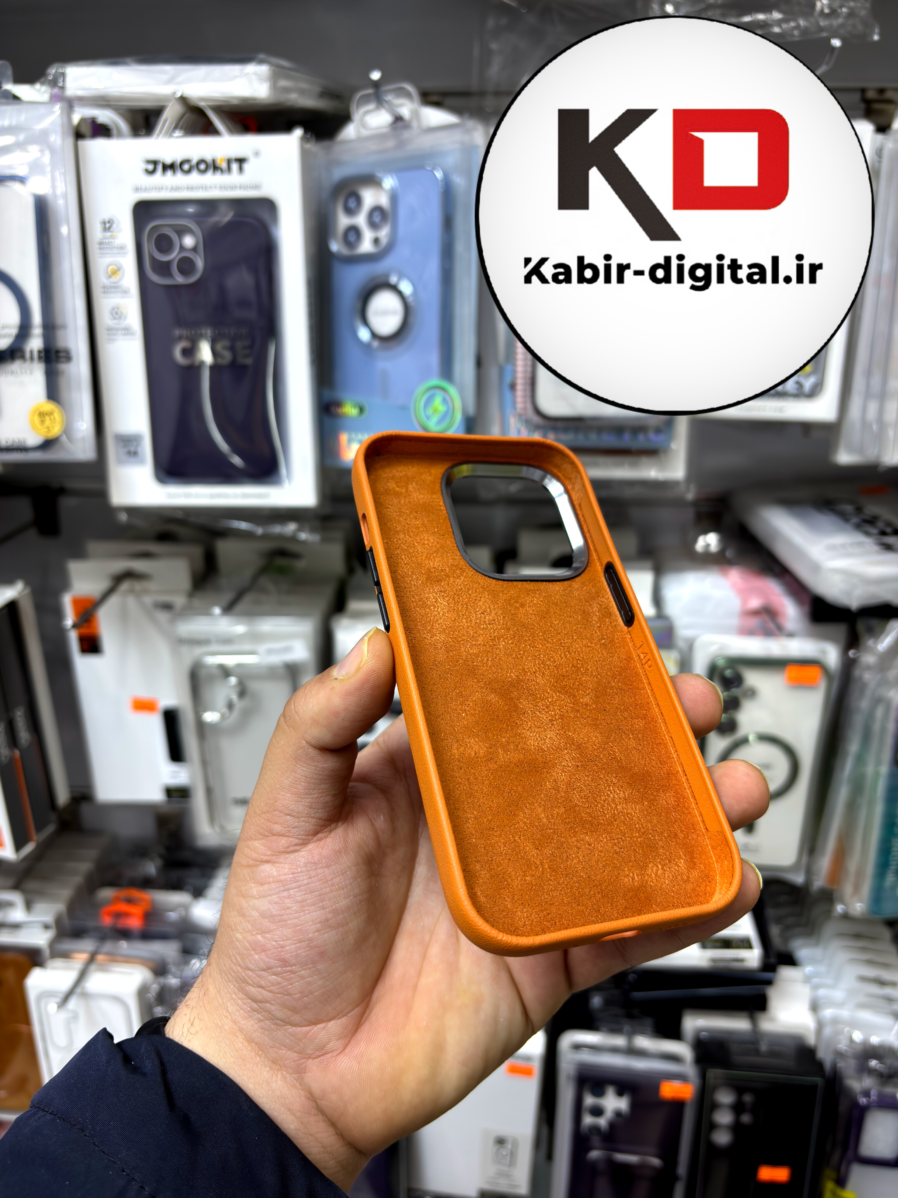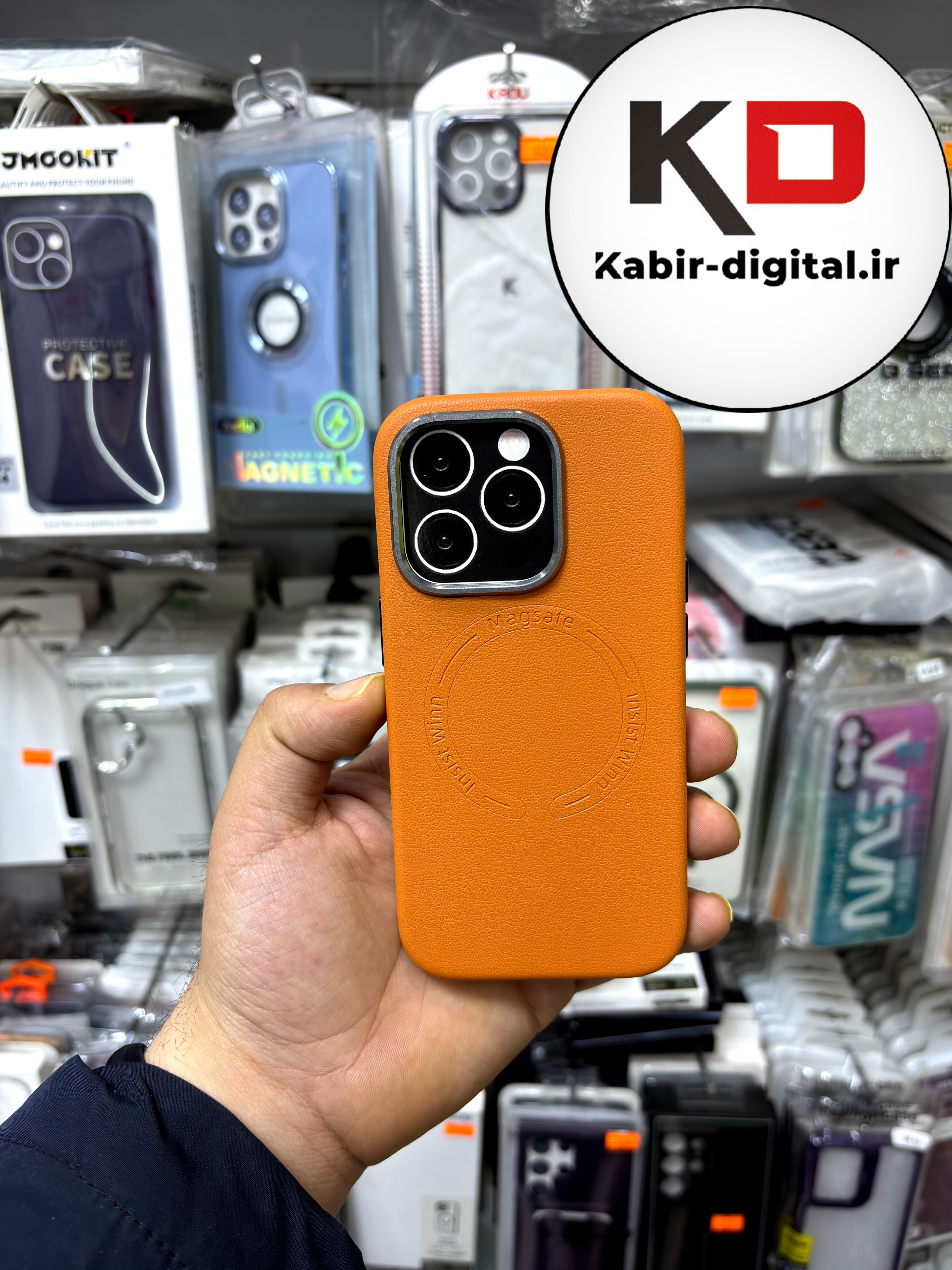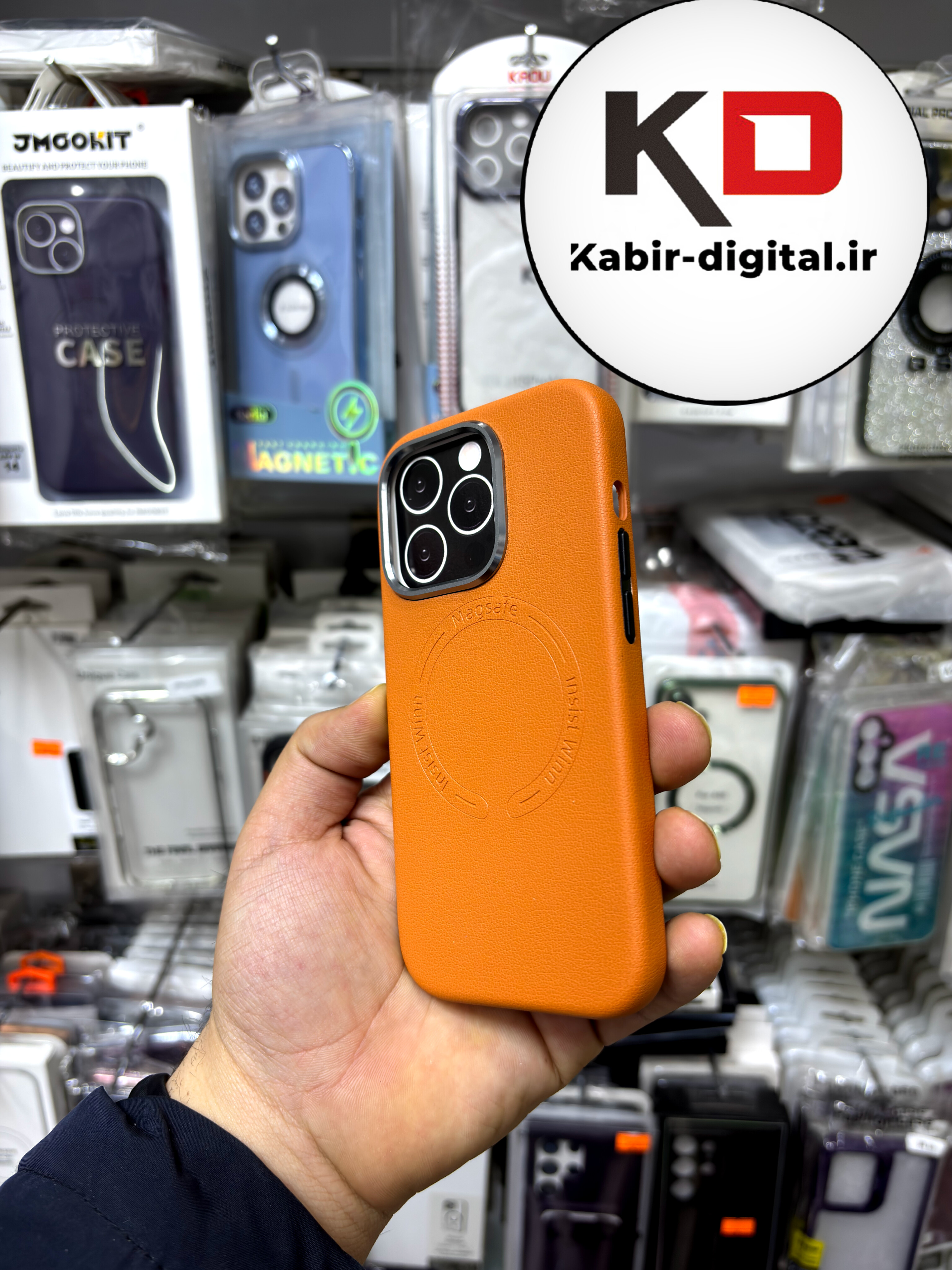 کاور گوشی آیفون iphone 14 Pro طرح چرم اورجینال مگ سیف لنز کرومی عسلی