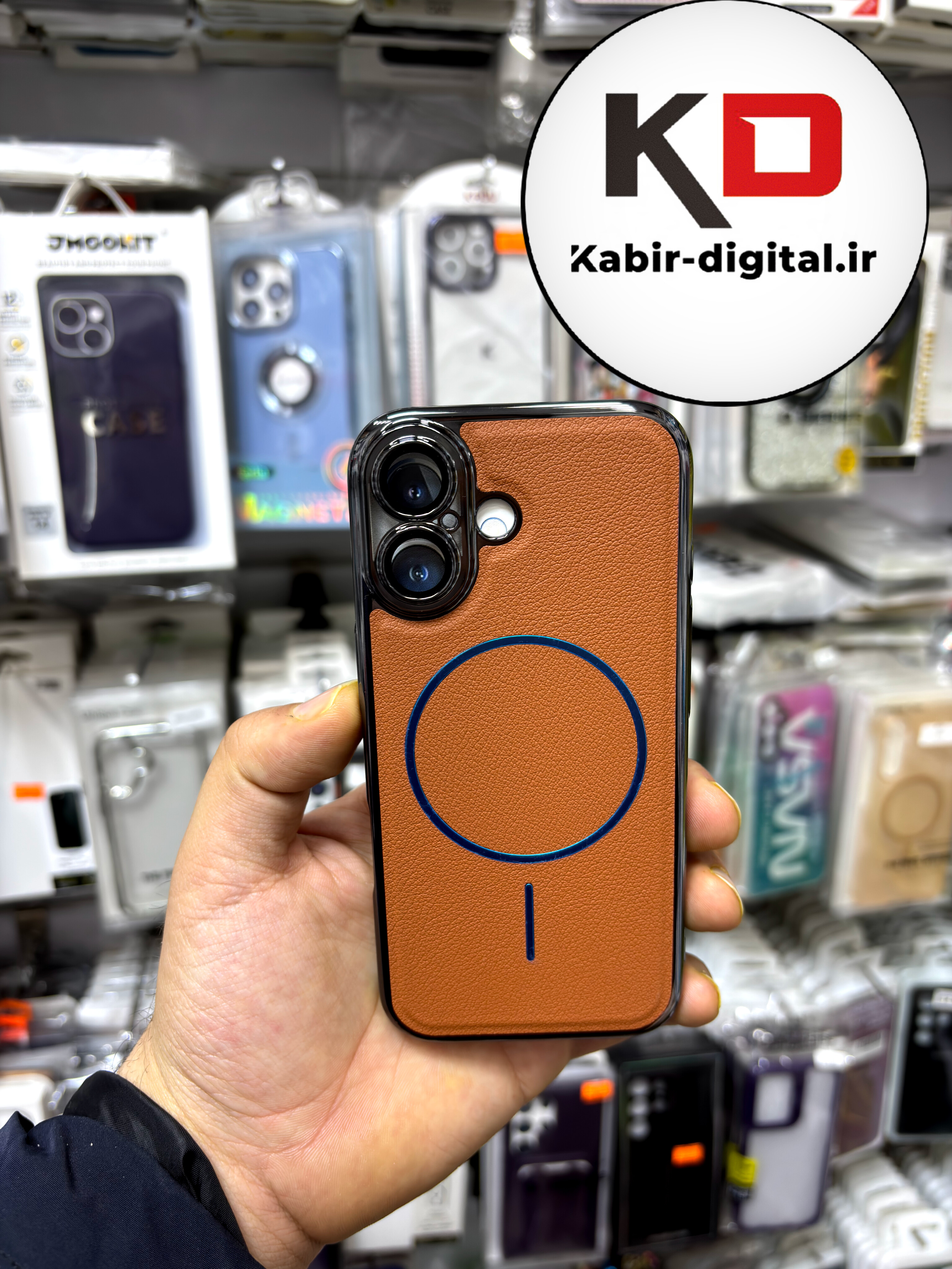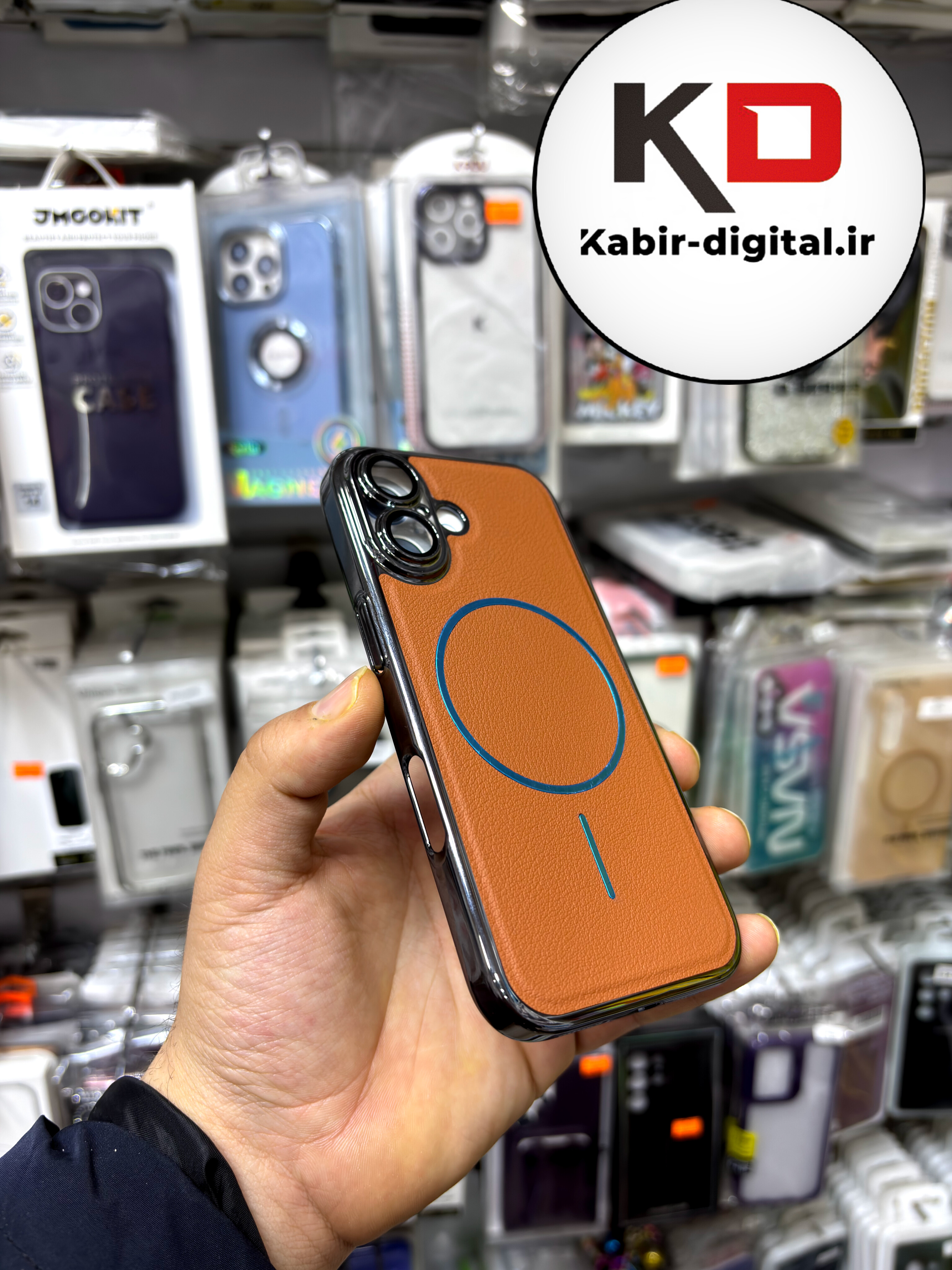 قاب گوشی iPhone 17 آیفون Leather Case مگ سیف Magsafe Silver اورجینال چرم محافظ لنز دار شیشه ای قهوه ای